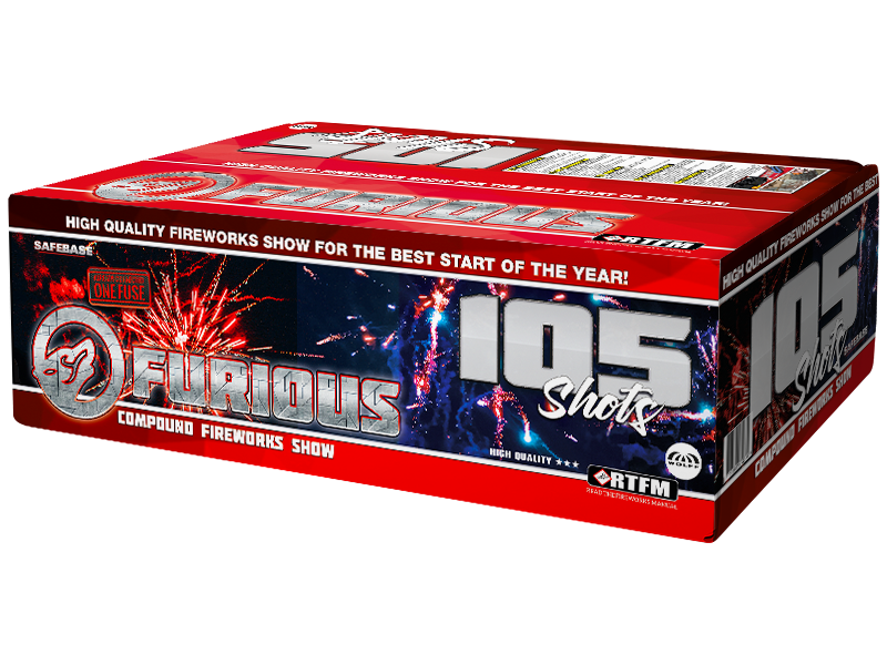 Furious nDeze bak ramt er gelijk vanaf het begin op los! Fenomenale waaier-effecten zorgen voor een professionele vuurwerkshow met prachtige kleuren en 105 schoten! n nKruitgewicht 2808 Gram nTube diameter 25 / 30 nBrandtijd 60 Seconden nHoogte 30 m. – 35 m. Furious Goedkoop vuurwerk kopen bij Vuurwerkwinkel Breda