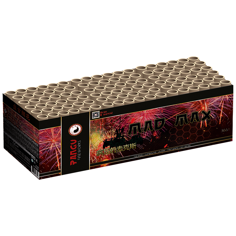 De Mad Max is een 108 schots compound met buizen in 25mm kaliber. Deze gekke Max kunt u misschien al kennen uit het verleden. Inmiddels is Max naar de sportschool geweest om wat af te slanken, en nog krachtiger zijn siereffecten te verwerken. In deze compound zitten sierlijke ghost, gekleurde dahlia, palm, moving star en crackling effecten.