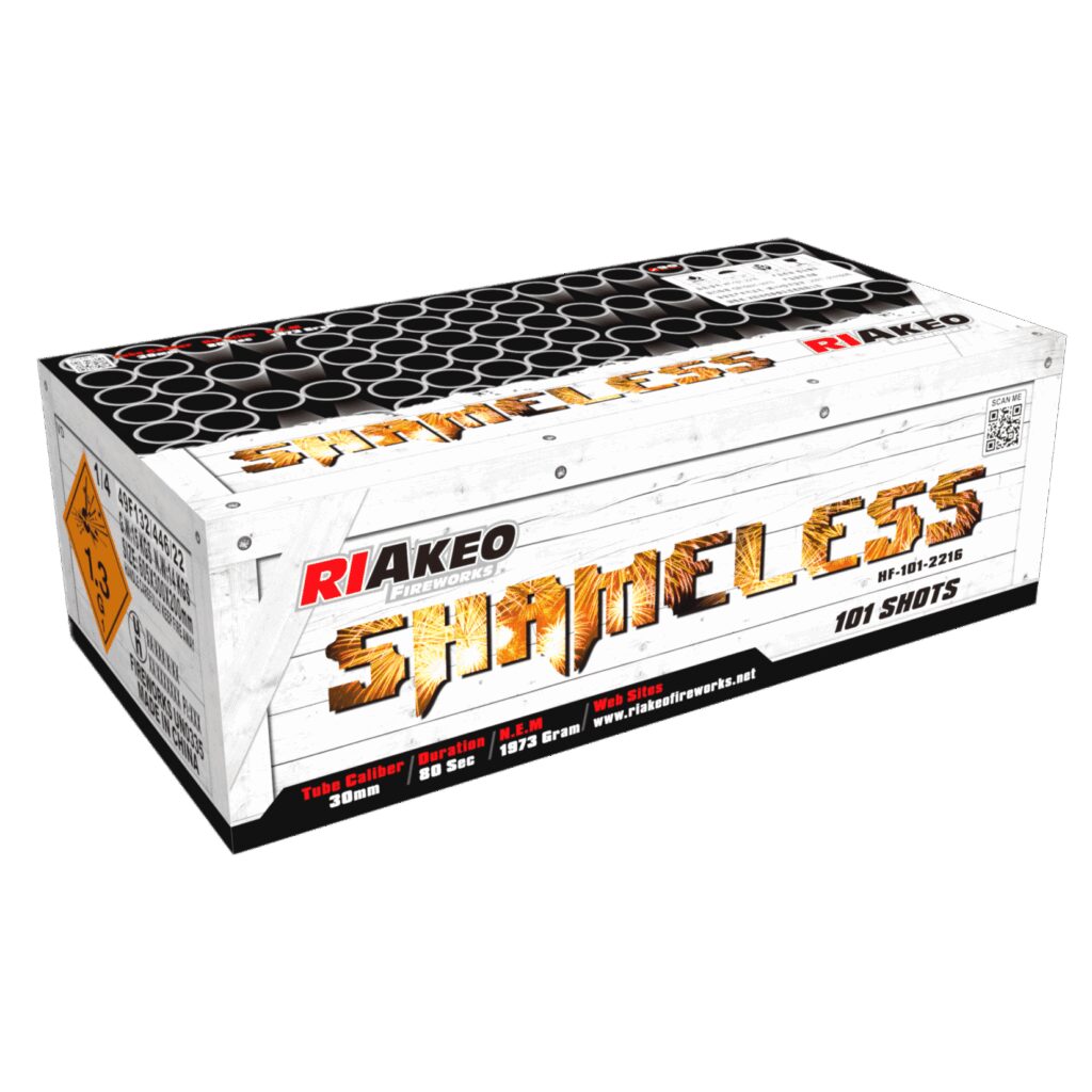 nDe Shameless van Riakeo is een 101 schots compound met bijna 2 kg NEM n30mm shots in waaier: I Shape, Z Shape of W Shape.n nEffecten:n nHoogwaardige premium effecten zoals: nDiverse gouden effecten, flasher boeketten met kleurrijke dahlia’s of Crackling Chrysanthemum zijn slechts drie van de exclusieve effecten in deze hoogwaardige composiet.n nDit product is verboden in Nederland.